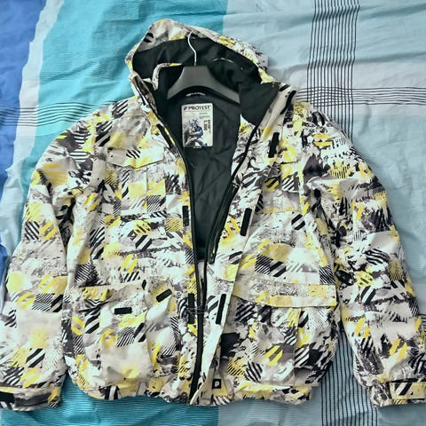 Protest XS talvitakki, jossa on raidallinen kuvio vihreän, mustan, violetin ja valkoisen sävyissä. Takissa on vetoketjulla suljettava etuosa, huppu ja taskut. Sopii kylmiin sääolosuhteisiin ja ulkoiluun. Kai- kai 48 cm