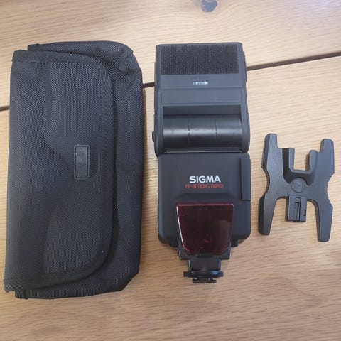 Käyttämätön kameran salama alkuperäisessä pakkauksessaan.