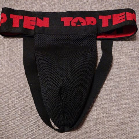 Noin 15 vuotta vanha, alle 10 kertaa Hokutoryu Ju-jutsun alkeiskurssilla käytetty Fairtex-merkkinen alasuoja.