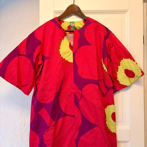 Myytävänä käytetty Marimekon tunika, joka on valmistettu Pieni Unikko -kuosisesta silkistä. Tunikassa on pieni pystykaulus, lyhyt etulista ilman nappeja sekä leveät mansetit hihansuissa. Pyöristetyssä helmassa on sivuhalkiot. K-K mitta 54 cm. Ovh. 220 €. Etulista alaosa on hieman haalistunut käytöstä/pesusta. HUOM. koiratalous. Nouto tai lähetys, jolloin ostaja maksaa postikulut.