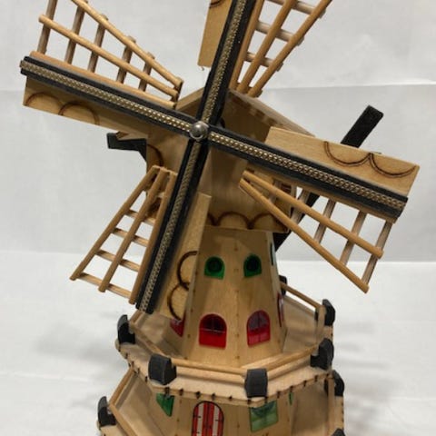 Tuulimyllyssä valo, vieterillä toimivat pyörivät siivet, soittaa sävelmää "Iloinen Amsterdam". Kokonaiskorkeus 30 cm.