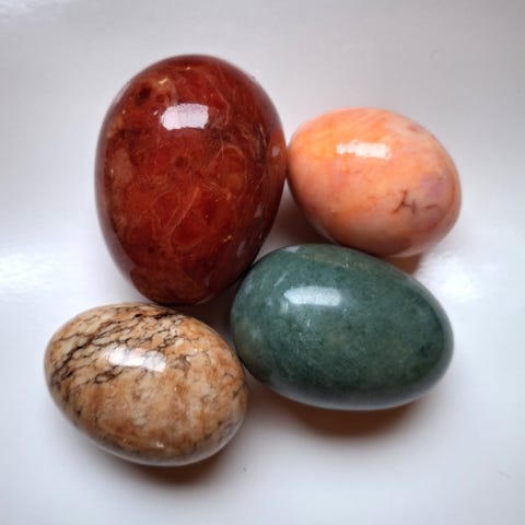 Myydään kuvassa näkyvä upea kokoelma koristeellisia kivimunia.