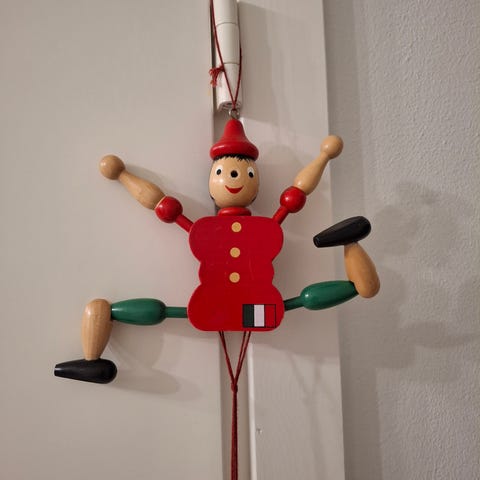 Puinen sätkynukke. joulukoriste, joka koostuu puisista liikkuvista nukkehahmoista. Koristeet on valmistettu puusta ja maalattu punaisella, valkoisella, mustalla ja sinisellä värillä. Hahmoissa on naru ripustamista varten. Soveltuu joulunajan sisustukseen.