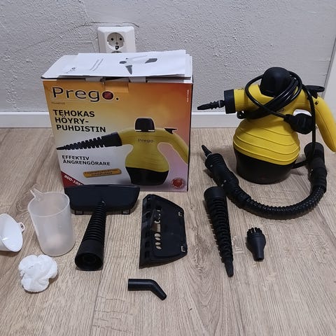 Uudenveroinen käsihöyrypuhdistin. Kaikki suuttimet,lisäosat,käyttöohje ja alkuperäinen laatikko mukana.