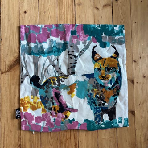 Vallilan karhu (en muista virallista nimeä) tyynynpäälliset, uudenveroiset, toisella puolella karhun pää ja toisella puolen koko karhu. Koko 43cm x 43cm.