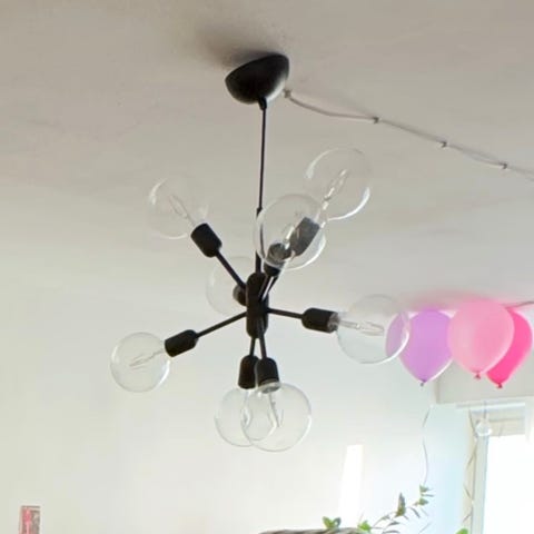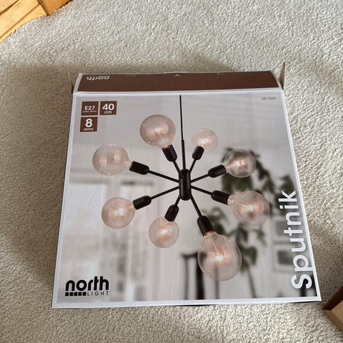 Sputnik kattovalaisin. Halkaisija noin 84 cm, valaisinosan korkeus noin 40 cm. Ripustuskorkeus säädettävissä.