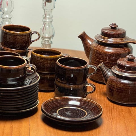 Arabia Mahonki teekupit ja -lautaset. Kuppeja 8kpl ja asettilautasia 9kpl. Yhdessä lautasessa lasituksessa vaaleampi piste. Kunto kuin uudet.