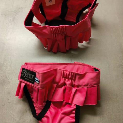 Kerran käytetty ja konepestyt! Täysin ehjät ja muutoinkin hyvässä kunnossa. Housuissa säädettävä tarra kiinnitys, pysyvät hyvin paikallaan. Olleet yhdet juoksut Welsh corgi cardigan nartulla.
