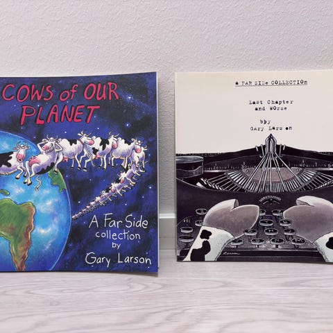Gary Larsonin The Far Side Gallery- sarjakuvat, pehmeäkantiset, molemmissa hintalappu viimeisellä aukeamalla.