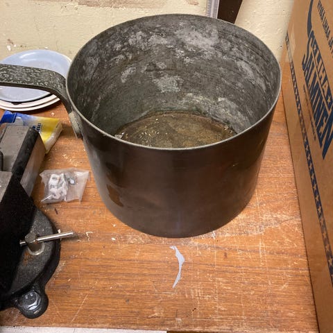 Kasarin sisäpuoli tinattu, kahvan niittikiinnitys vähän löystynyt. Mitat kork.75mm pit.185mm.