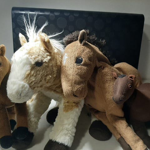 Myynnissä monta leluhevosta kaikki eri merkkejä ja hieman eri kokoisia jne.