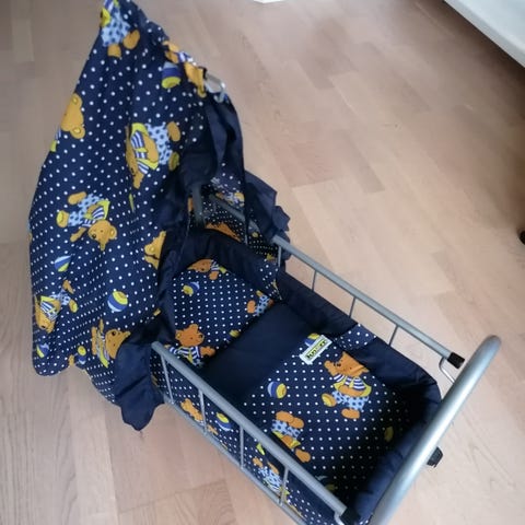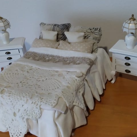 Pieni puinen nukkekodin sänky, varustettu harmaa-valkoisilla vuodevaatteilla, joissa koristeelliset kuviot ja teksti 'My Love'. Mukana tyyny ja peitto, joissa pitsikoristeita. Kokonaisuus on käsin valmistettu. Sängyn peitteet ja tyynyt on liimattu kiinni.