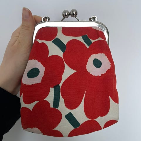 Erinomaisessa kunnossa oleva Marimekon kukkarolaukku, johon mahtuu hyvin esim. tabletti. Postikulut 6,9 lisätään, noutaakin sopii.