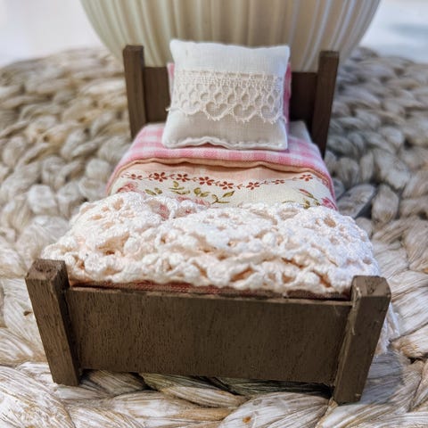 Pieni puinen nukkekodin sänky, jossa on sininen vuodevaatesetti, jossa valkoisia kuvia kuten hevosia ja muita hahmoja. Vuodevaatteet sisältävät peiton ja tyynyn. Sopii nukkekodin sisustukseen. Kokonaisuus on käsin valmistettu. Sängyn peitteet ja tyynyt on liimattu kiinni.