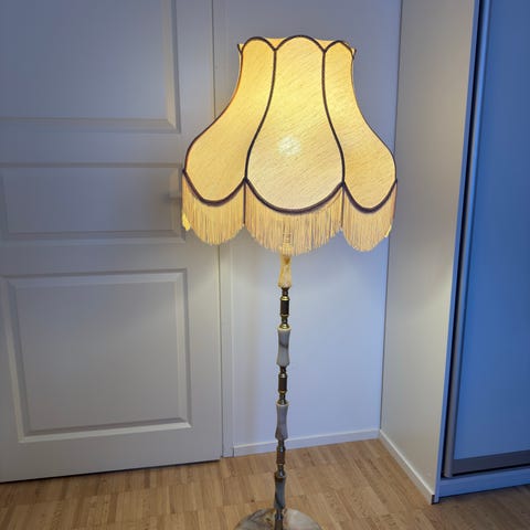 Kaunis jalkalamppu. Kierrekoristeinen messinkijalka 1950-luvulta. Samppanjanvärinen, ruskein hapsuin koristeltu varjostin 1980-luvulta. Valaisimessa on kaksi lamppua, joilla molemmilla oma narukatkaisija. Toimii hyvin.