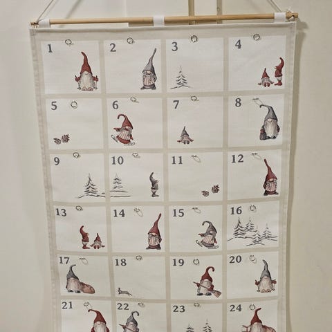 Myydään joulukalenteri, jossa pussit kiinni hakaneuloilla ja loput numeroista on pussien toisella puolella. Hinta 5€