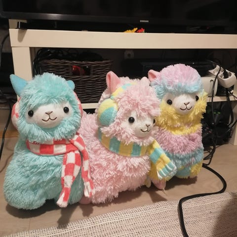 Käsityönä valmistettu pehmoinen alpakka koristeeksi, keräilijälle tai isomman lapsen hoivattavaksi, valmistajana Inkari . Karva on aitoa alpakan karvaa, joka keritään elävästä alpakasta säännöllisesti. Tämä alpakka on erikoisempi pitkäkarvainen alpakka, jollaisia valmistetaan harvoin. Pitkäkarvainen ei ole niin muhkean pörröinen kuin tavallisemmat Inkarin alpakat. Vatsassa karkeampaa karvaa, jossa valkoisen seassa hieman ruskeaa sävyä. Leuassa näkyy tummempaa kangasta hieman valkoisen karvan alta. Alpakan toinen takajalka on seistessä vähän yli 1cm ilmassa, mutta tätä ei juuri huomaa pitkien karvojen alta (viimeinen kuva). Ollut meillä koristeena ja pysyy hyvin pystyssä seisomassa. Mukana uusi alpakka-aiheinen joulukortti kirjekuorella. Alpakan korkeus noin 32 cm.