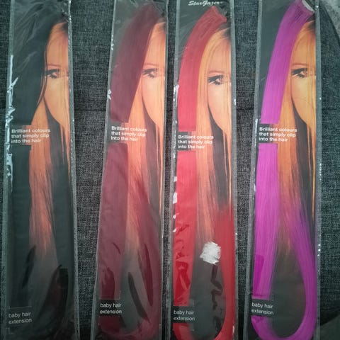 Suurin osa Glitteristä ja vaaleanpunainen ruusu hiusklipsi Bik Bokista. Uusi Accessoires meritähti hiusklipsi. Uusi vaaleansiniturkoosi läpikuultava hiusklipsi. Vaaleanpunainen kukkakuvioitu ponnari kahdella hännällä on vain muutama kerta pidetty. Fuksianpunainen rusettisolki erittäin vähän käytetty. Muut enemmän pidettyjä.