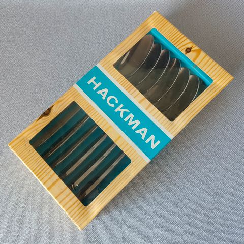 Hienot Hackman Sorsakoski Carelia aterimet, jotka ovat uushopeaa. Kiiltävät ja kauniit. Jokaisessa on pieni kaiverrus AR.