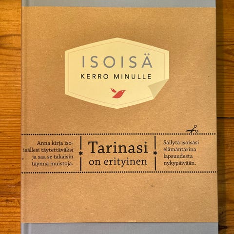 Tämä innostava täytettävä kirja on lahja, joka auttaa syventämään suhdetta rakkaimpien kesken. Anna kirja isoisällesi ja pyydä häntä kertomaan elämäntarinansa kirjan kysymysten avulla. Täytettyään kirjan hän voi palauttaa sen sinulle.
