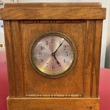 Goldb"uhl- merkkinen, saksalainen,toimiva, vedettävä pöytäkello.Vihertävänruskehtavat marmoriset, alustat ja sivutolpat.Roomalaiset numerot.Kork 16 cm,Lev 14 cm.Paino 742g