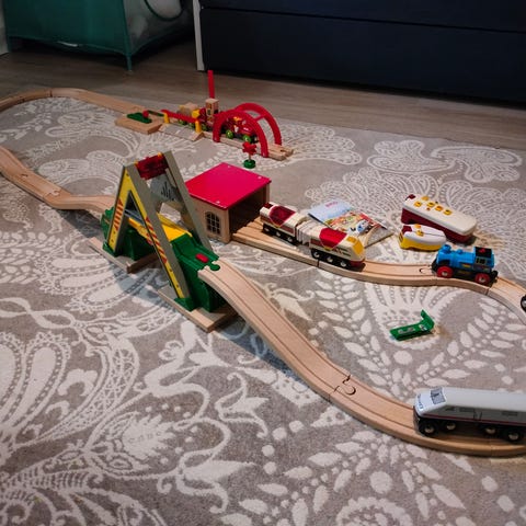 Selling set of train tracks + battery power train + remote control battery power train + crane and everything you see in the pictures for €100.