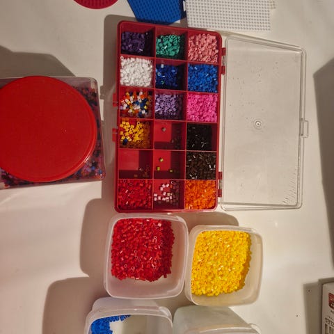 Myydään 4 eri väristä hamahelmipussia jossa jokaisessa n. 2000kpl sekä kaksi pyöreää alustaa.