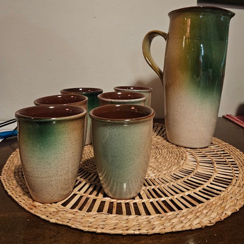 keraaminen muki + alulautanen sekä 2 kpl keraamisia juomalaseja