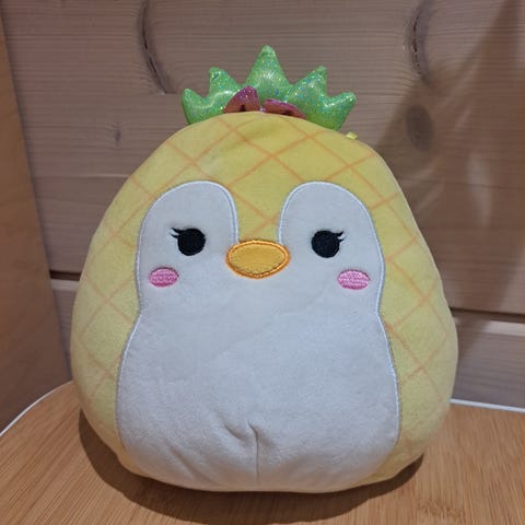 Squishmallows pehmolelu, ananaksen muotoinen hahmo ja lisäksi pinkki pehmo.