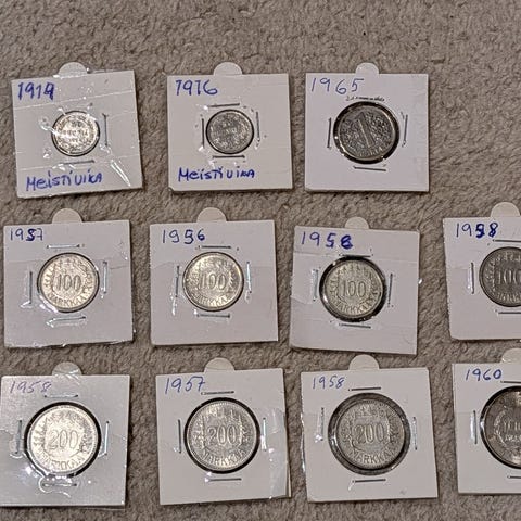 Myynnissä käyttämättömät hopeiset kolikot. 100mk v. 1956 H, paino 5.2g. 200mk v. 1958 H, paino 8.3g. Yhteishinta 16€. Kuntoluokka 8-10.