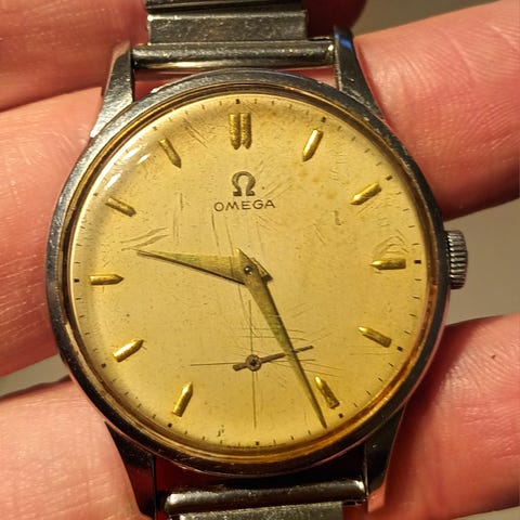 Herrasmiehen vintage Omega 50-luvulta. Toimii, mutta historiasta ei tietoa. Visuaalisesti hyvässä kunnossa, ei kaiverruksia, sekuntinäyttö on hieman patinoitunut ja tummunut. Noin 1950-60-luvulta. Halkaisija 35 mm.