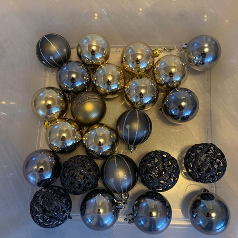 26 kpl. Kauniita hyväkuntoisia mustia joulukuusen palloja laatikossa.
