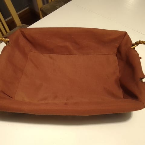Kori valkoinen punaruutuisella nauhalla, sisällä kangas.