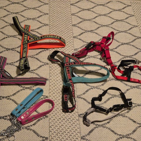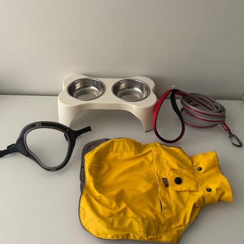 Pienen koiran takkeja ja valjaita.
