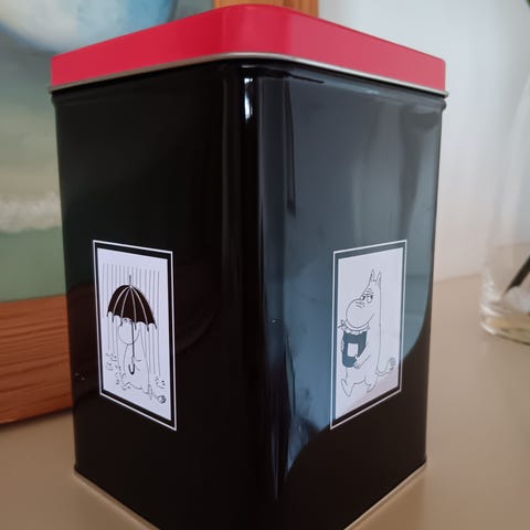 Kuvanmukainen muumi peltipurkki.