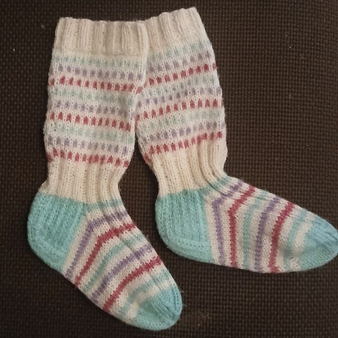 Annetaan vaaleanvioletit villaneule lapaset. Käsin tehty. Sopii n. 3-vuotiaalle. Kämmenosan pituus on 10 cm. Peukalon pituus on 4 cm.