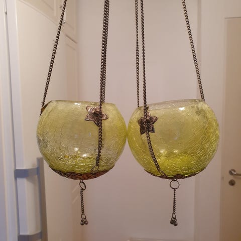 Riippuvat tuikkukupit, 4 kpl. Kaksi sinistä ja kaksi violettia. Pituus 47 cm. Koukut eivät kuulu kauppaan. Kuvausta varten pesussa lähti kuppien reunasta väriä. Voit ostaa yhden 4 e hintaan tai useamman yhteishinta 15 e.