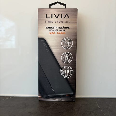Avainsanat: Livia, Neo, power bank, varavirtalahde, 10000 mAh, USB-laturi, matkavaravirtalähde, puhelimen laturi,
