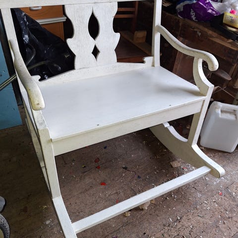 Hyväkuntoinen ja siisti keinutuoli. Maalipinta hyvä, ei moitteita. Mukaan valkoinen pitsipehmuste.