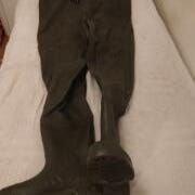 Saappashousut, vihreät, kengän koko 47. Valmistettu vedenpitävästä materiaalista, housuissa säädettävät olkaimet ja kumisaappaiden yhdistelmä. Soveltuu kalastukseen ja ulkoiluun kosteissa olosuhteissa.