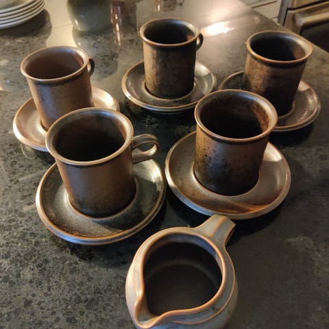 Myydään Ruska kahvikupit 6kpl. Kunto hyvä. Toisessa kuvassa näkyy leima, joka ei ole enää nähtävissä kaikkien kuppien tai asettien pohjissa. Leima Värtsilä Finland 2 -74.