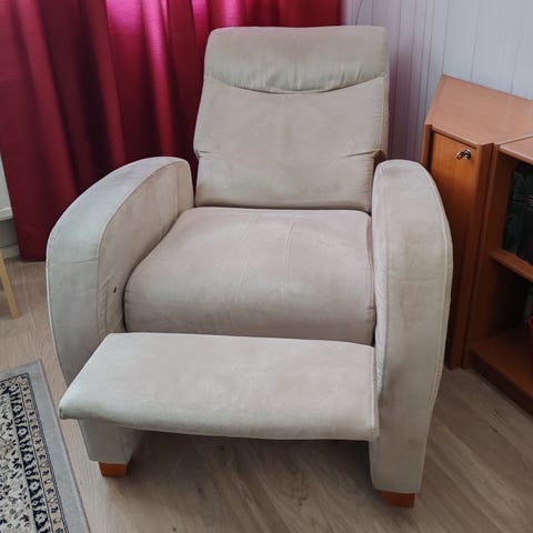 Myydään keinuva ja pyörivä mekanismituoli: avattava jalkarahi ja makuuasentoon kallistuva selkänoja. Istumasyvyys 56 cm. Verhoilu: paksu ja kestävä nahkamainen antiikkikangas. Väri: harmaa.