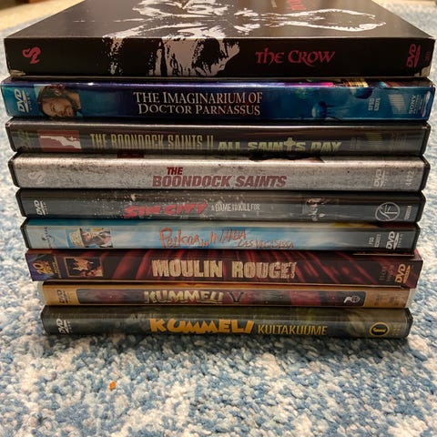 DVD-elokuvapaketti sisältää useita eri nimikkeitä eri genreistä. 1,5e/kpl. Minimipostitus 10e.