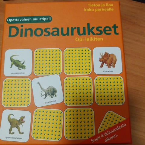 Hyväkuntoinen dino muistipeli. Kotelossa käytönjälkeä, mutta kortit oikein siistit.