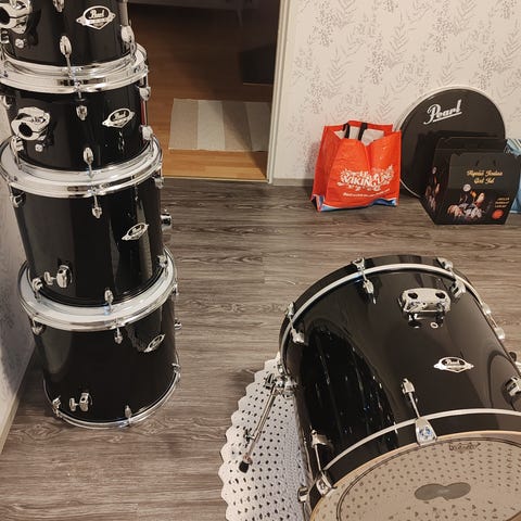 Kolme räkkitomia, lattiatomi, bassorumpu ja tomitelineet räkkitomeille. Mustat, joitain käytön jälkiä; muutamia naarmuja ja bassorummun vanteissa kulumaa. Muuten oikein hyvässä kunnossa ja hyvin pidetyt.