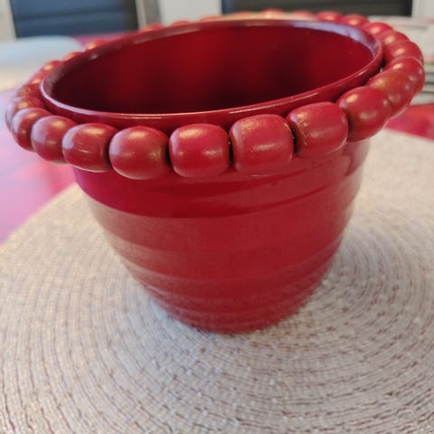 Suojaruukku koriste-esine, punainen, Koristehelmillä reunustettu esine, joka soveltuu sisustukseen.helmet ovat rautalangasta kiinni toisissaan ja liimattu kuuma liimalla ruukkuun