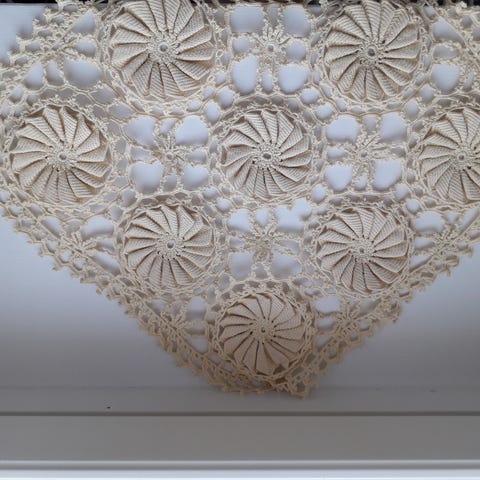 Kalalangasta virkattu liina/verho, liina on vanha ja pesty koneessa joten kudos on hyvin napakkaa.