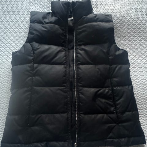 Musta Tommy Hilfiger toppaliivi koossa M. Melko kapea malli. Liivissä on vetoketjut ja napit, vetoketjulliset taskut, irrotettava huppu ja hupussa myös vielä erikseen irrotettavissa oleva tekoturkis reunus. Kunto siisti ja ehjä, ei huomautettavaa.