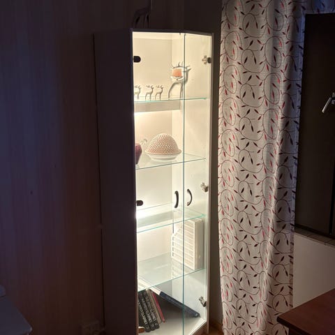 Viola lasivitriini, jossa useita lasihyllyjä ja alhaalla levyhylly. Sopii esineiden ja koristeiden säilytykseen ja esillepanoon. Yläosassa valot. Väri vaalea pyökki, materiaali lasi ja puristtelevy (mdf). Koko keskikokoinen, sopii erilaisiin tiloihin kuten olohuoneeseen tai toimistoon.