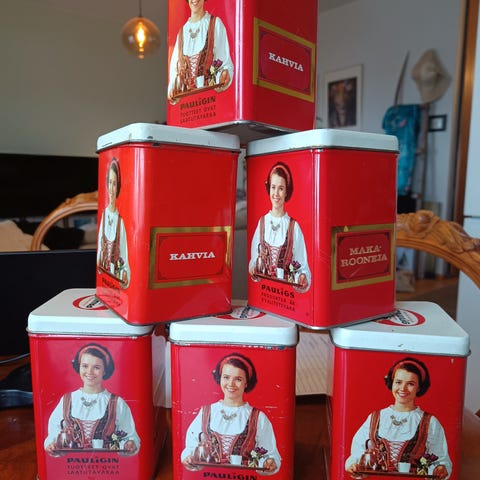 Paulig Paula peltipurkkit kohtalaisessa kunnossa, vaatii pesua. Kaikki yhteensä 10€